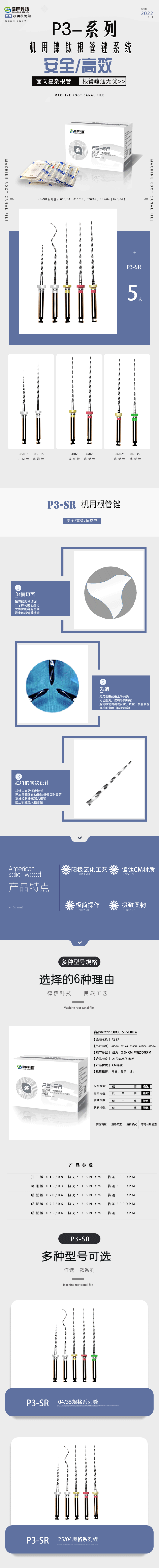规格:015/08、015/03、020/04、025/04、025/06 开口锉 015/08 扭力:2.5N.cm 转速500RPM 疏通锉 015/03 扭力:1.5N.cm 转速300RPM 成型锉 020/04 扭力:2.5N.cm 转速500RPM 成型锉 025/04 扭力:2.5N.cm 转速500RPM 成型锉 025/06 扭力:2.5N.cm 转速500RPM